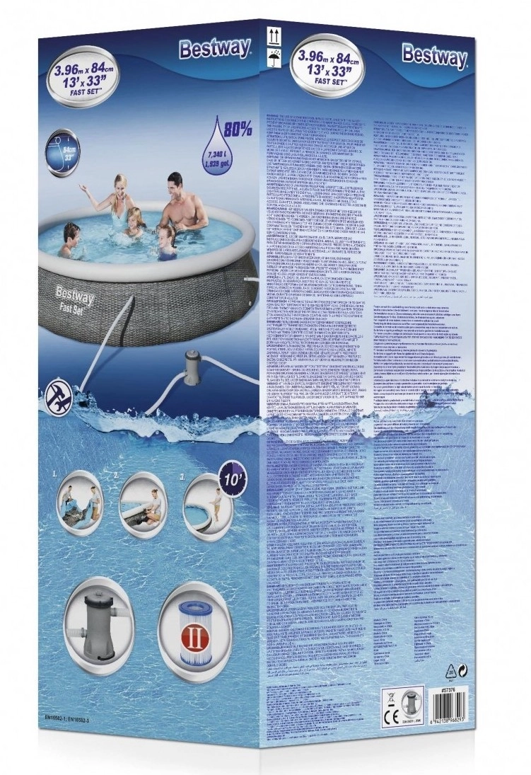 - The Bestway 13ft Fast Set Rattan Pool comes as a complete set; featuring inflatable swimming pool, 530gal filter pump with filter and a repair patch