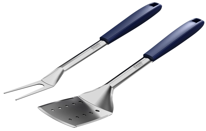 A multi-purpose BBQ companion, this stainless steel spatula and fork set has cushioned non-slip handles and a slotted handle for easy hanging.