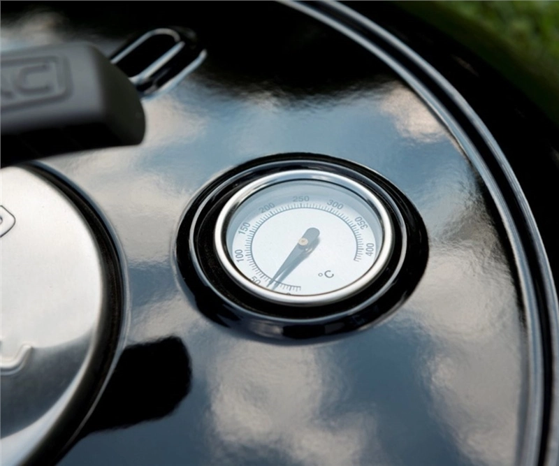 The porcelain enamelled fat pan has flame peepholes to keep a check on the flame during cooking. When you have finished cooking simply lift the fat pan off for easy cleaning. The dome lid, with a stay-cool handle and thermometer, also hooks onto the back of the BBQ to act as a wind protector.