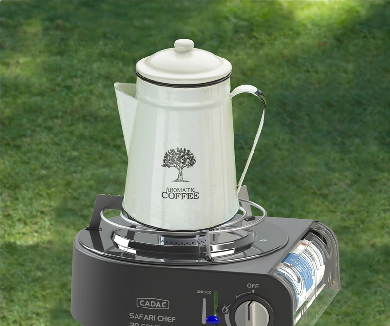 Offering multiple interchangeable cooking surfaces, the unit comes with a ceramic-coated BBQ Grid, Flat Grill Plate and a removable pot stand for use with your own kettle and pans. The enamelled Dome Lid also doubles as a pot for cooking and an enamelled fat pan with flame peepholes is also included.