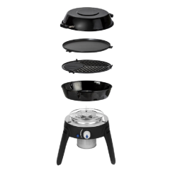 This portable and versatile gas BBQ, weighing less than 4kg, includes four interchangeable cooking surfaces. These are the pot stand, the BBQ top, the non-stick flat griddle and the pot (also used as a dome). These all pack into a convenient carry bag.