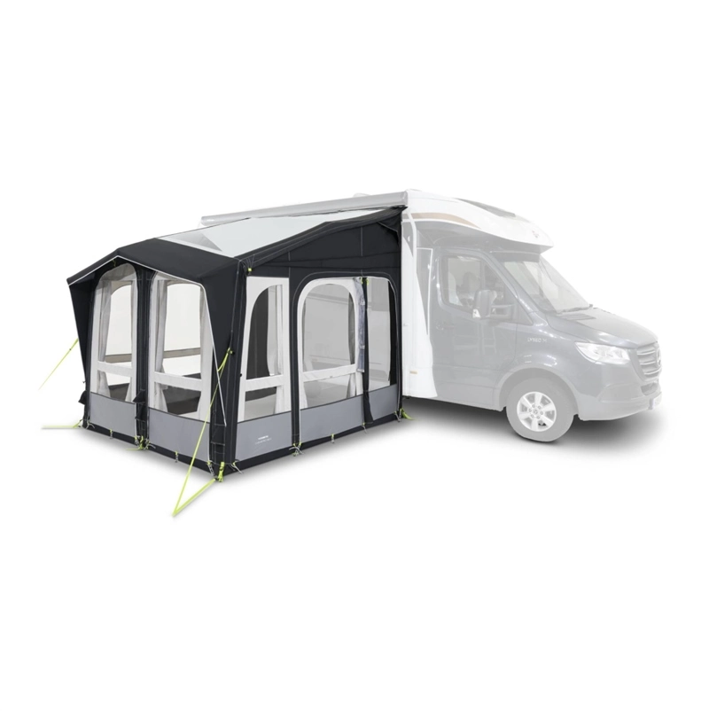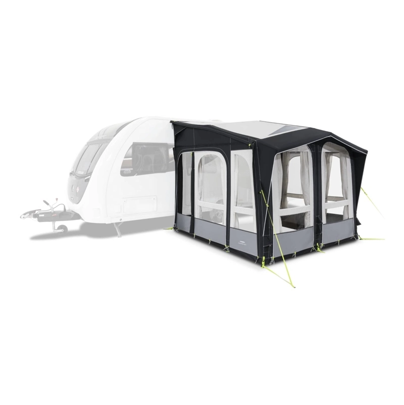 With its Dual-Pitch™ roof apex and integral canopy the Club AIR Pro is instantly recognizable. The clever front panel configuration offers two front doors, or simply unzip and remove the panels to open the awning up veranda style