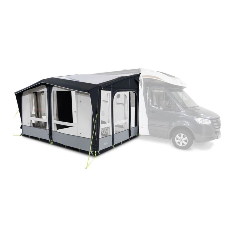 With its Dual-Pitch™ roof apex and integral canopy the Club AIR Pro is instantly recognizable. The clever front panel configuration offers two front doors, or simply unzip and remove the panels to open the awning up veranda style