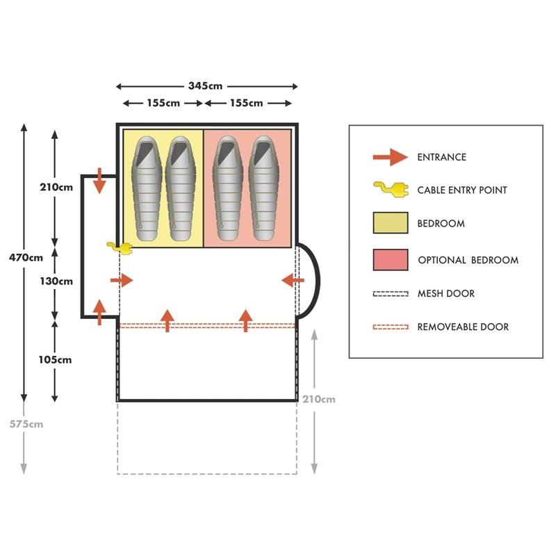 - Overall Footprint: 335 x 470 cm (335 x 595 cm with canopy)