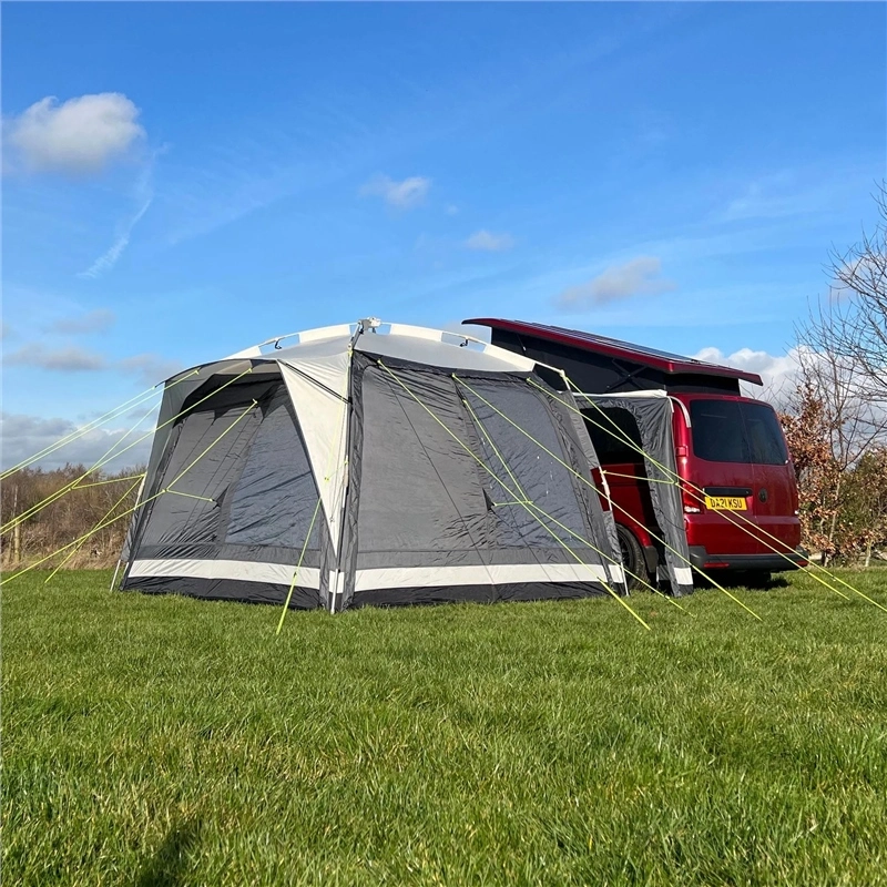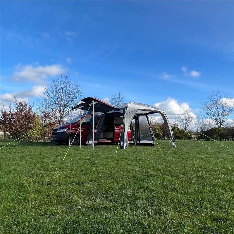 The Motordome Kamper Hub is both Campervan and Caravan compatible, benefiting from a drive away ability to leave a standalone awning on the pitch on your days out. Featuring the Khyam Tailored Vehicle Connection Tunnel (design registration 4029632). All Khyam connection tunnels allow the sliding door of your Camper, Panel-van Conversion and Motorhome to open fully within the confines of the connection tunnel* – there’ll be no need to move fabric out of the way when opening the door. Uniquely shaped and tailored, the panels on each side of the tunnel fit snugly against the side of your camper, pegging it securely into place via a fully adjustable pegging loops.