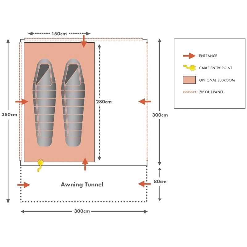 Twin J-Doors on the connection tunnel allow for easier accessibility on either side of the awning. AirFlow Doorways are featured via the main doorway and secondary J-Door with the use of a separately zipped, full length, integral mesh doorway. This allows the secondary J-Door to be opened fully, exposing a full mesh ventilation panel.