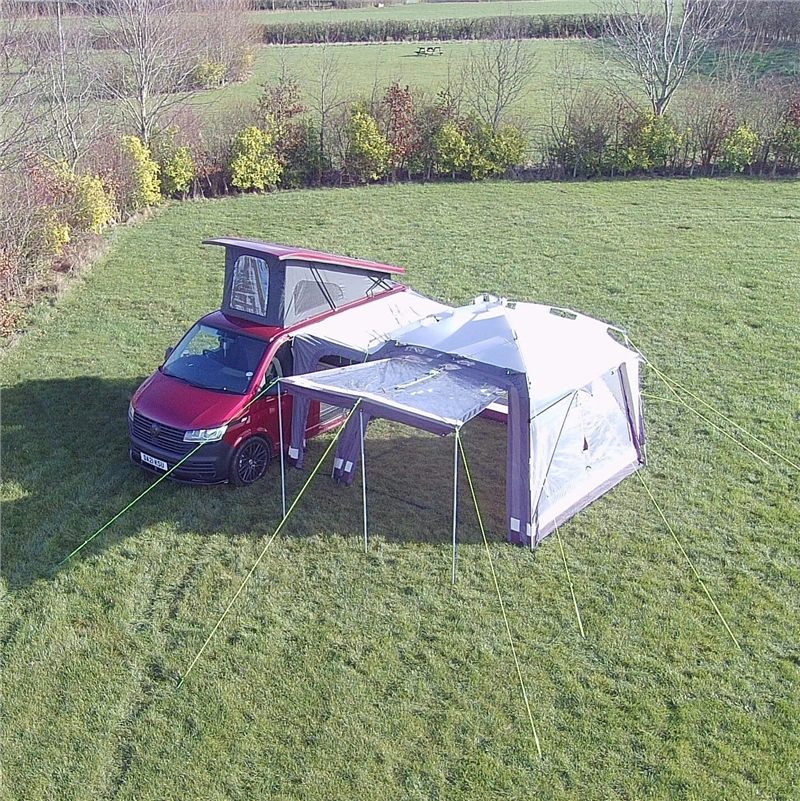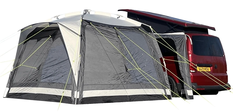 The door panels on the 3 exterior sides of the awning are completely removable thus allowing ‘zip in’ accessories like the Hub Bedroom Annexe to be added on any side or all sides for larger groups. This awning could sleeper 12 people, although we’d not recommend more than 8. The removable door panels, as well as all the ‘zip in’ accessories, are all fully interchangeable, so whether you are connecting to a left or right hand drive vehicle or you have twin sliding doors, you can choose where you want your main front door or bedroom.