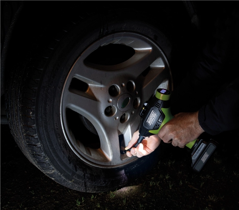 - 12V cordless lithium ion – no cables or drain on car battery