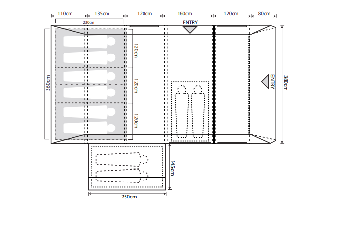 230cm deep, darkened twilight micro polyester 6-person bedrooms with a 2/2/2 zip in divider plus extra central toggle-in divider panel