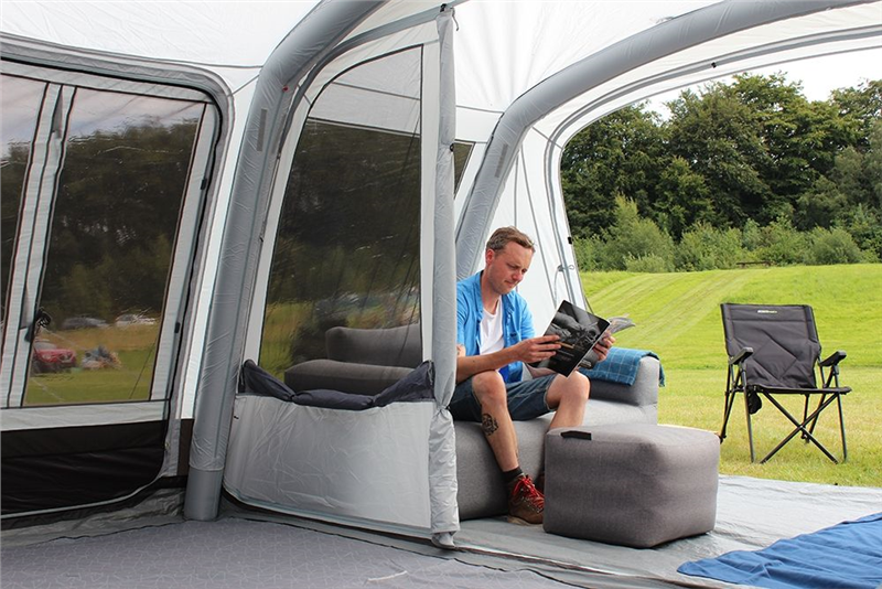 We have implemented a New double width patio-style side door with a zip-back phoenix mesh ventilation fly screen panel, phoenix mesh ventilation fly screen panels are also found in the central divider panel, and upper left hand side window to optimise air circulation whilst keeping insects out. The addition of a windowed central divider door panel greatly increases flexibility, broadening the number of available configurations, by splitting the spacious interior between a generous living area and utility front porch; this is accompanied by zip-up curtains too and can be rolled back to further increase usable living space, should you wish to. Also added for 2021 is the option of an Enclosed Front Porch Extension that zips onto the front of the tent, increasing the usable space dramatically.