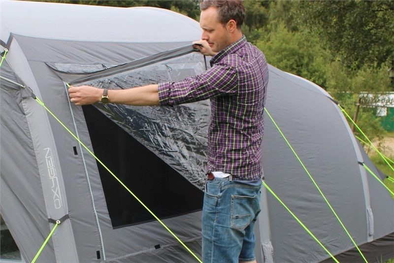 The expansive PVC windows permit an excellent, crystal-clear vista of the surrounding environment, whilst illuminating the tent interior during daytime hours, these are accompanied by toggle-in curtains, which can be rolled completely back, or toggled fully in for total privacy at night. A PE groundsheet has been fully sewn-in to add convenience when pitching, reduce water ingression and help prevent bugs from accessing the tent. This model features a full zip-back front door, accompanied by large windows and toggle in blinds, and a small canopy area designed to offer protection from the elements when entering and exiting the tent. We have implemented a closable phoenix mesh ventilation fly screen panel on one of the side windows, to allow the option of creating a through flow of air whilst keeping insects at bay; this is crafted from an assisted healing ‘smart’ material, with the structurally incorporated ability to self-repair any snag damage caused by consistent usage over time.