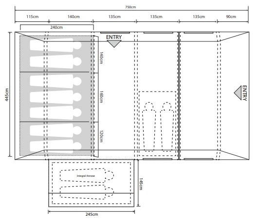 - Footprint 705 x 445cm (Main body) + 245 x 145cm (Side Annexe)
