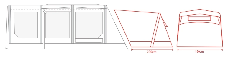 The Movelite Annexe is securely fitted to the awning using a zip with a weatherproof cover, simply zip off the rear panel of your awning and zip the annexe on. Feed the steel pole through the sleeve and attach to the ring and pin at each end, then peg down the 2 far corners ensuring all edges are tight and straight. Finish by pegging all remaining pegging points and guy ropes.