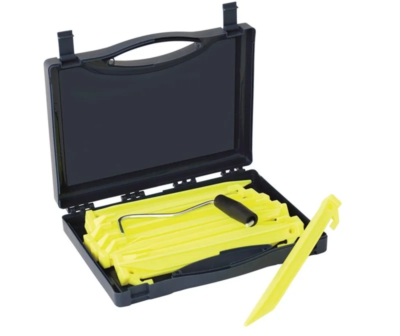 Suitable for soft to medium grounds with few stones, the box comes with 14 plastic pegs, peg remover, and extractor and carry case.