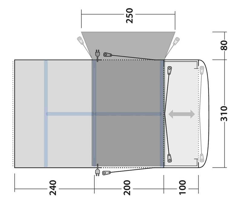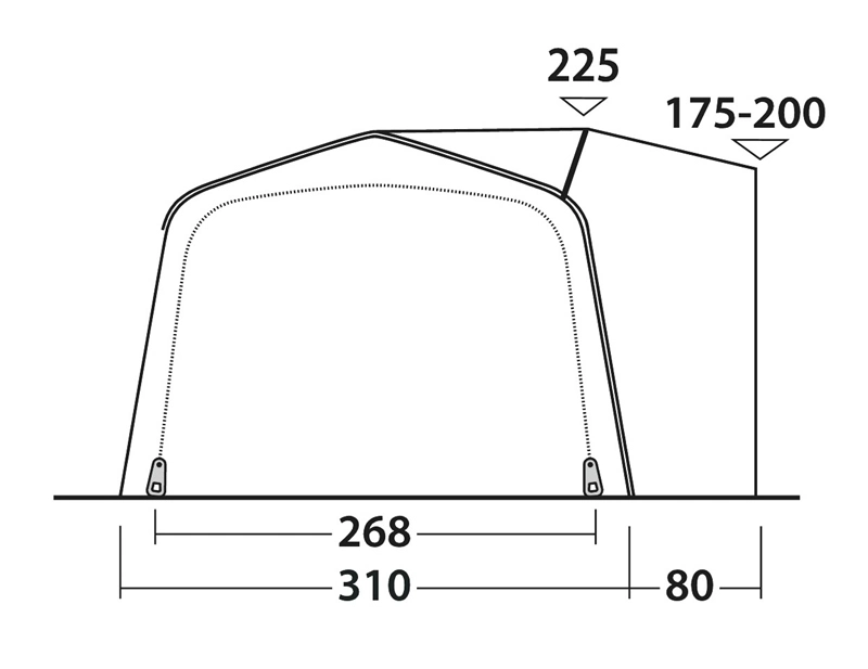 An outstanding choice for larger families, or when holidaying with friends. The inflatable Outwell Jonesville 440SA Flex drive-away awning is pitched parallel to either side of most campervans via its removeable access zone, there’s plenty of room for everybody to unpack, stretch out and relax in comfort under its durable, fully waterproof, ripstop fabric. With ample headroom and easy access, you certainly won’t be falling over each other on the campsite. Plus, you can enjoy more space in the van on days out as the awning can be left freestanding securely on your pitch. A large canopy over the movable front wall, with insect-proof mesh screen, offers either deep shelter for you to connect with the natural world or more enclosed living space for eating, playing games or just chilling out together. Prepared for the Outwell Nightlight System (patented) providing built-in lighting inside and outside the tent powered by optional ONS Light Unit Sets.