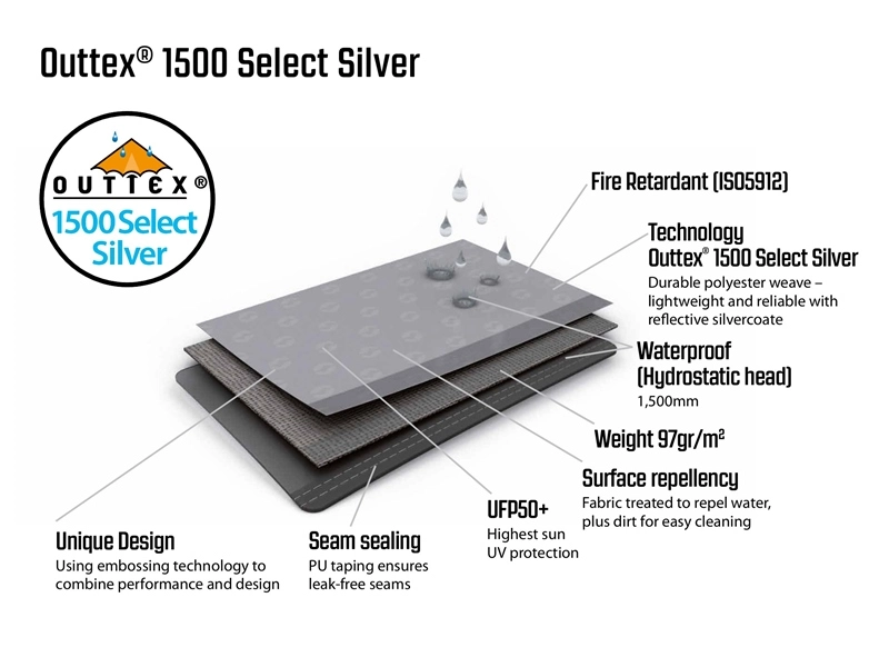 - Flysheet – Outtex® 1500 Select Silver, 100% polyester