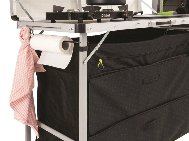 Magante Kitchen Unit keeps things neat, tidy and close to hand. Camp kitchen storage is provided by two shelves, hooks and magnetic knife holder on the back wall that brings a chic tile design to any pitch. With a 90cm worktop height and a stable base, we bring home kitchen comfort to outdoor food preparation.