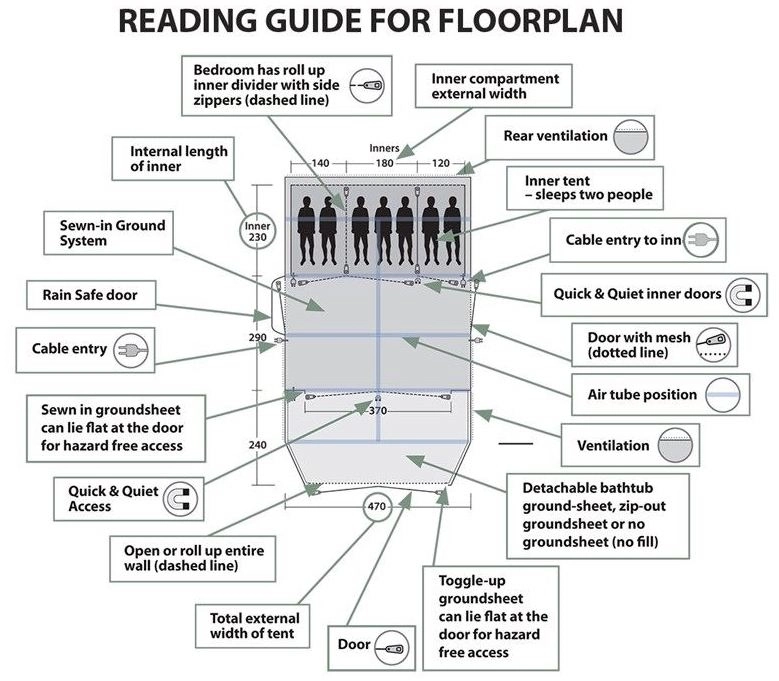 - Type of groundsheet – Sewn-in groundsheet in living area and detachable groundsheet in third zone