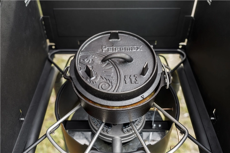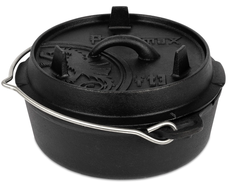 Thanks to the amazing characteristics of cast iron and the special structure of the surface, warmth is efficiently stored and distributed. The pre-treated surface (seasoned finish) makes a first seasoning unnecessary, and the sturdy Dutch oven can be used right away. In the open air, it is used on an open fire or with charcoal and briquettes. The raised edge of the lid makes it possible to place embers or charcoal also on the Dutch oven. The Dutch oven is thus heated from all sides and is for example suitable for baking bread.