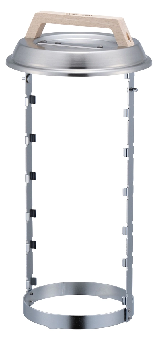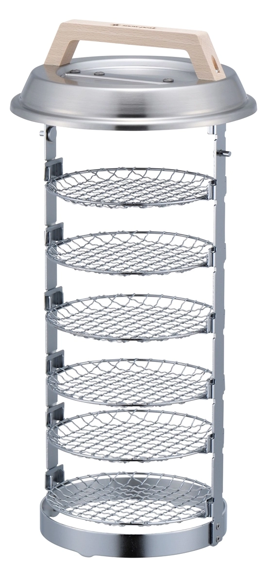 An elegant and easy to use smoker for backyard barbecues and campfield cookouts. Simply add wood chips and a few hot coals to the bottom layer, stack your meats, poultry, fish or cheese, and let the smoker do it’s thing. The adjustable lid can help with the air circulation within the smoker to maintain desired temperature, and fully removable grill nets allow you to adjust the level of smokiness as well as transfer your dish directly to the your table.