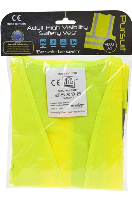High visibility safety vest that can be used to sporting events marshalling or riding bikes at night. Vest size: 69cm x 58cm with reflectors over the shoulders and across the body for added visibility.