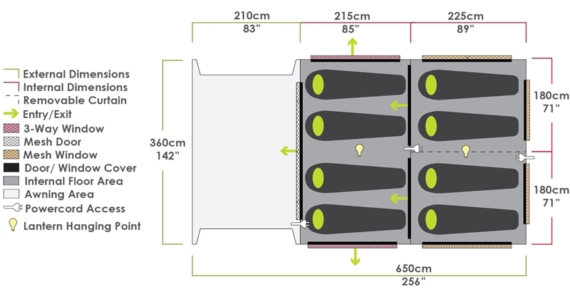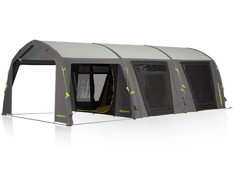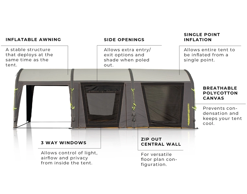 The fully inflatable awning on the Airforce 1 V2 means the entire tent can be inflated from a single point, making set-up at the beginning of your family camping trip easier than ever. The zip-out central wall & bedroom dividing curtain convert this tent from an open-plan layout to a private and organized 3 room unit, giving you control of privacy & organization. Perfect for a growing family.