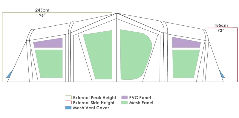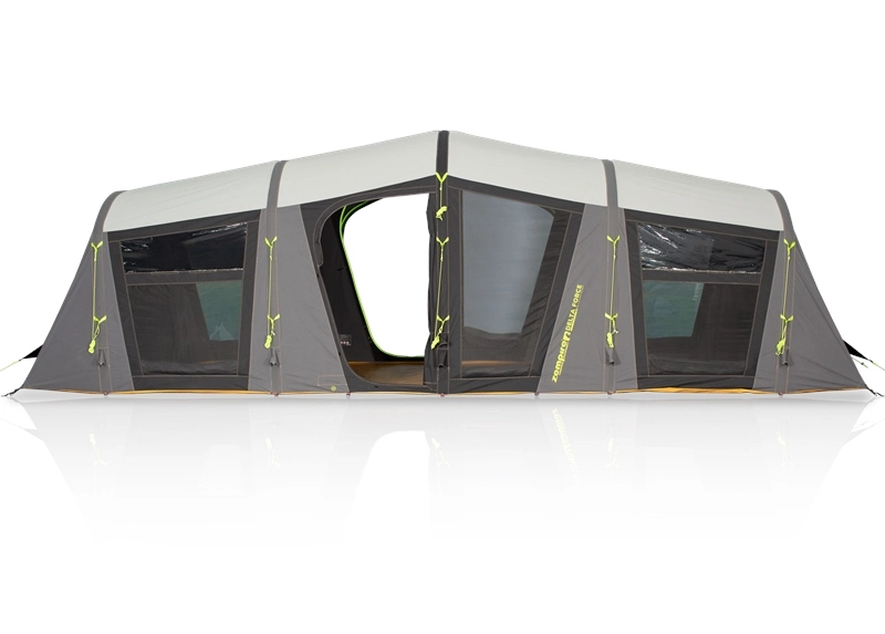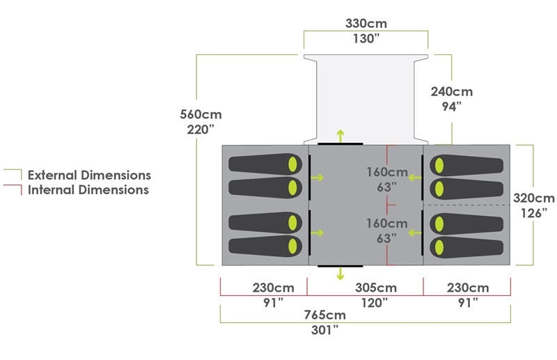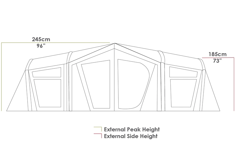 Layout | The Delta Force is the ultimate solution for a large family. Rooms on each side of the tent can comfortably fit two twin camp beds and feature two large internal controllable windows. These rooms are separated by a large central living room offering privacy for all. The living area features both front and rear access doors for convenience and offers an impressive 2.4m peak height. Your tent includes a bedroom dividing curtain to separate either bedroom into two, and is compatible with a second dividing curtain as an optional accessory to divide the sleeping space into four separate rooms.