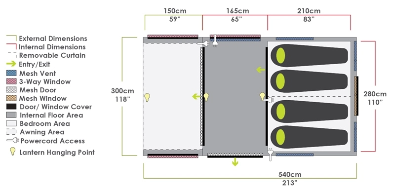 - BEDROOM / INNER FEATURES – 360° fold away inner door, Light diffusing fabric, Twin layer D doors (2), Zip out dividing curtain