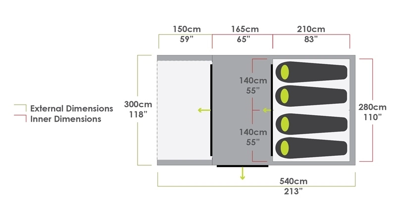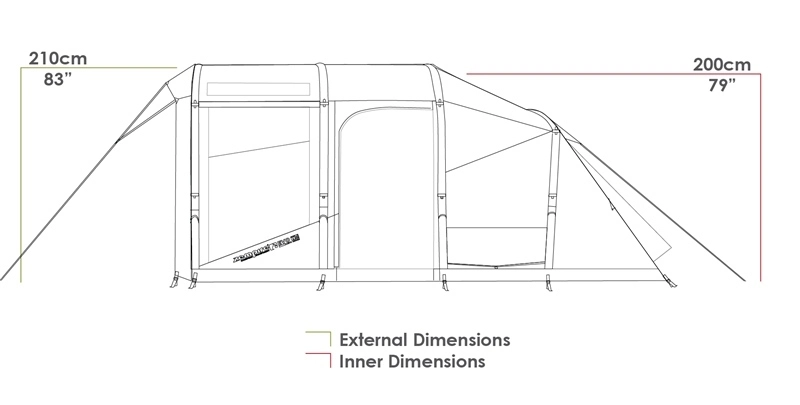 - BEDROOM / INNER FEATURES – 360° fold away inner door, Light diffusing fabric, Twin layer D doors (2), Zip out dividing curtain